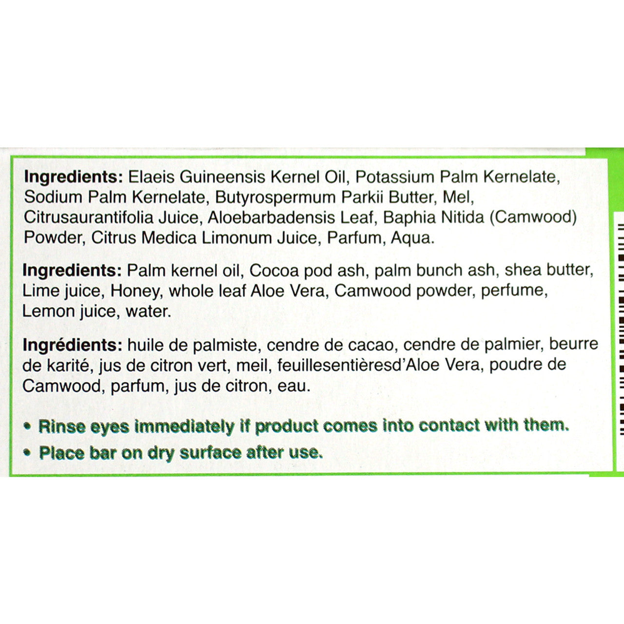 Palm kernel oil, cocoa pod ash, palm bunch ash, shea butter, lime juice, honey, whole leaf aloe vera, camwood powder, perfume, lemon juice, water.