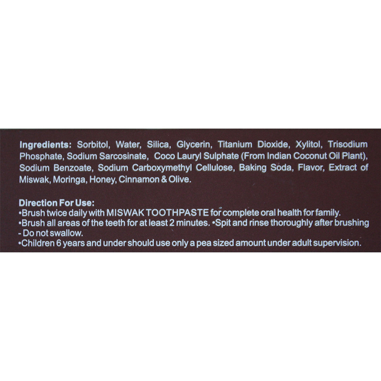 - Sorbitol, Water, Silica, Glycerin, Titanium Dioxide, Xylitol, Trisodium Phosphate, Sodium Sarcosinate, Coco Lauryl Sulphate (From Indian Coconut Oil Plant), Sodium Benzoate, Sodium Carboxymethyl Cellulose, Baking Soda, Flavor, Extract of Miswak, Moringa, Honey, Cinnamon & Olive